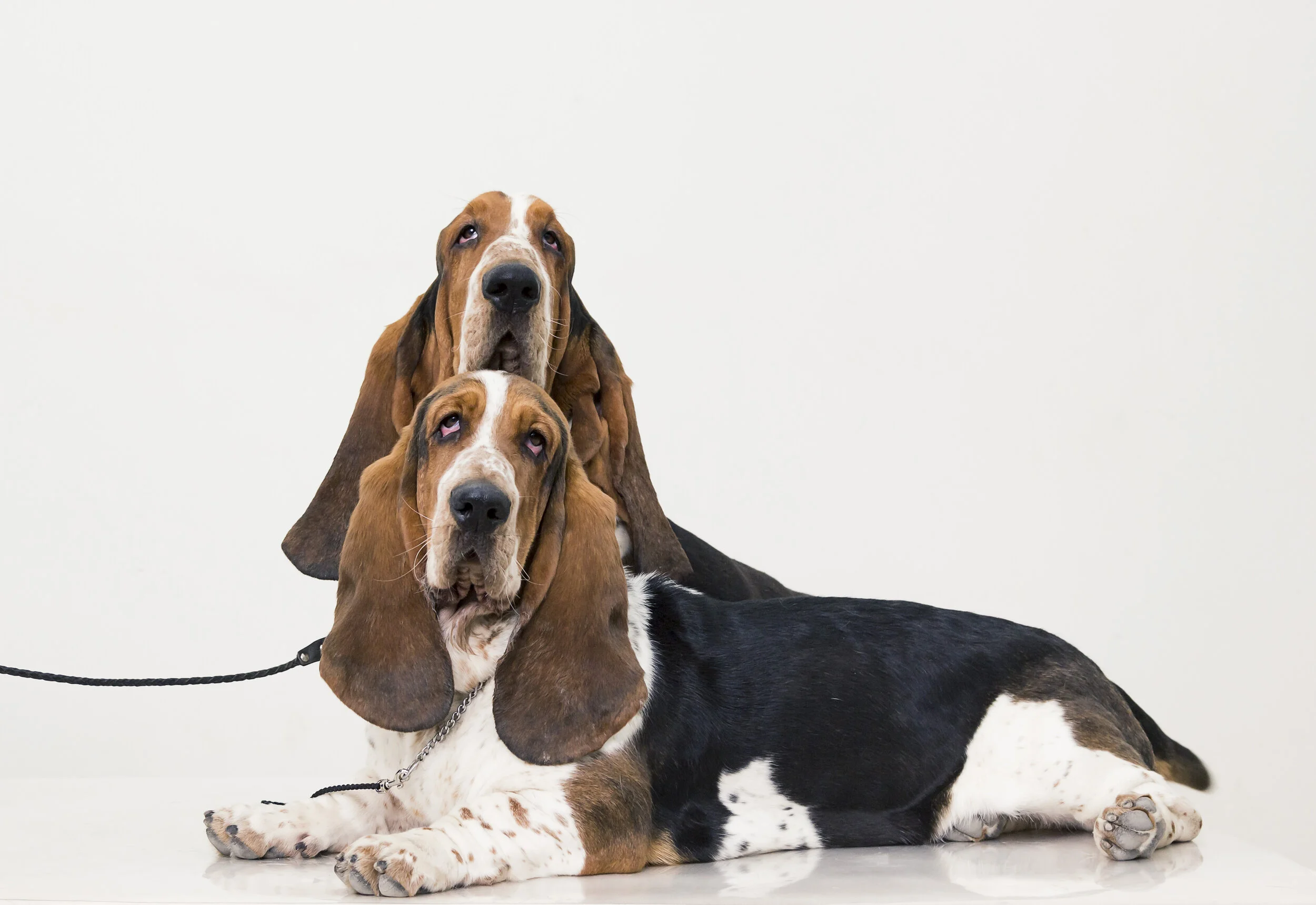 The Basset Hound stands no higher than 14 inches at the shoulder but, with his remarkably heavy bone, powerful little legs, and massive paws, he possesses big-dog strength and stamina. Bassets are famous for a large, domed head that features extremely long, velvety ears, mournful eyes, and a wrinkled brow, which give the breed the look of a sad clown. Built more for endurance than speed, the Basset moves in a deliberate but effortless manner. The breed’s scenting ability is uncanny; it’s said that among dogs only the Bloodhound’s nose is more accurate. Mild and agreeable at home, the Basset is stubborn on the trail and barks in a loud, ringing voice. Although they may not be wildly demonstrative in their affections, they are steadfastly loyal.