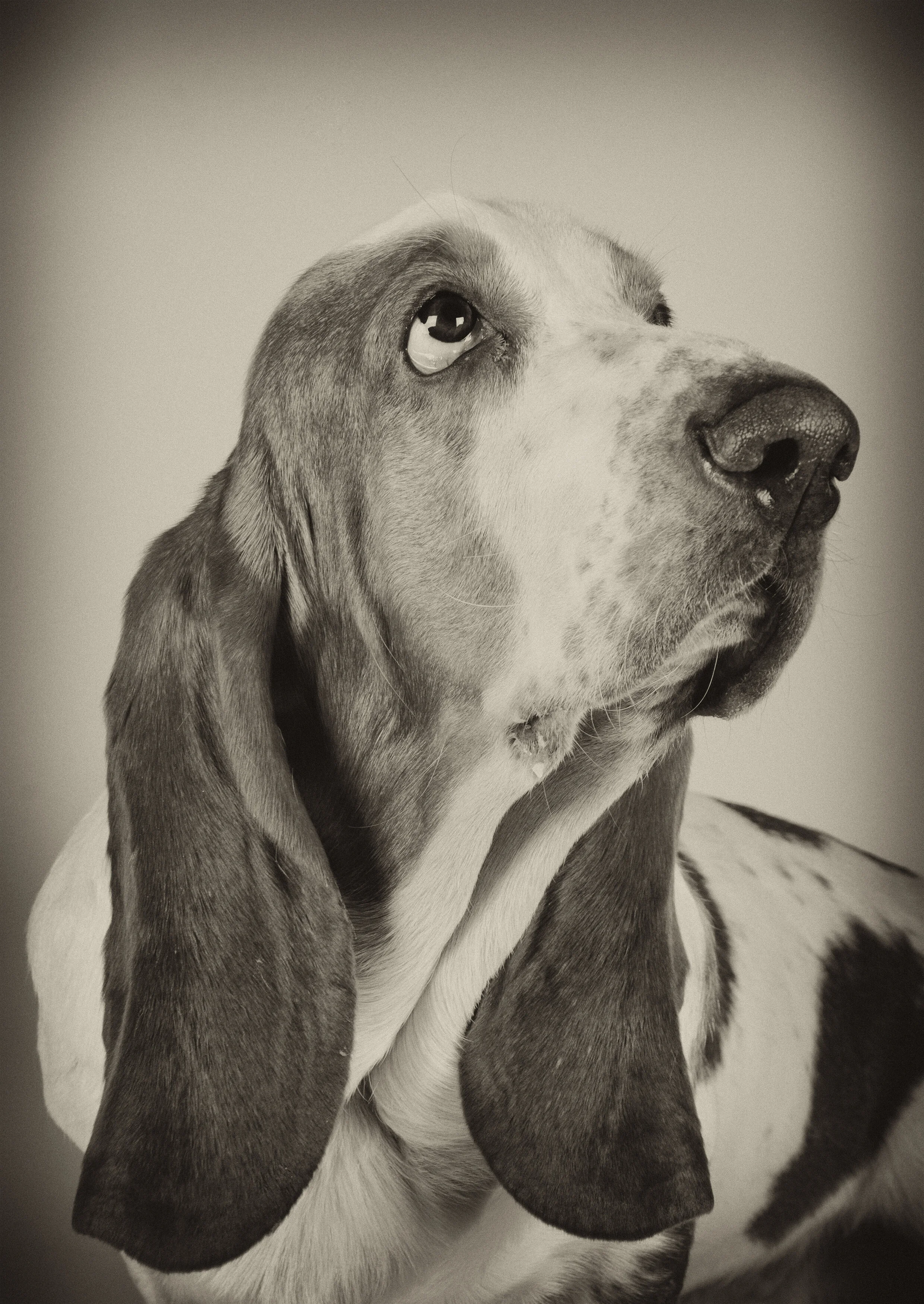Basset Hounds were originally bred in France and Belgium (“basset” is French for “low”). It is thought that the friars of the Abbey of St. Hubert were responsible for crossing strains of older French breeds to create a low-built scenting hound that could plod over rough terrain while followed on foot by a human hunting partner tracking rabbit and deer. Their accuracy and persistence on scent made Bassets a popular choice for French aristocrats, for whom hunting was a way of life.